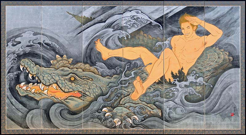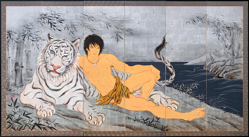 「《目覚めろ、野生! 鰐虎図屏風》は、トラの方しか売れなかったのね。なんでワニの方は買わないのか聞いたら、股をパカーンって開いてるのがイヤだって言われたの。『なんか、男がバカにされてるみたい』って。でも、女が大股開きしてるアート絵画は大量にある。女の画家も描いているし、男の画家もいっぱい描いている。だから私はわざと、ちょっとこれ見よがしに、男が股を開いているポーズを明る~く取らせてみたんだけど(笑)。それを見てどう感じるかは、世代によって違ってくるでしょうね」。